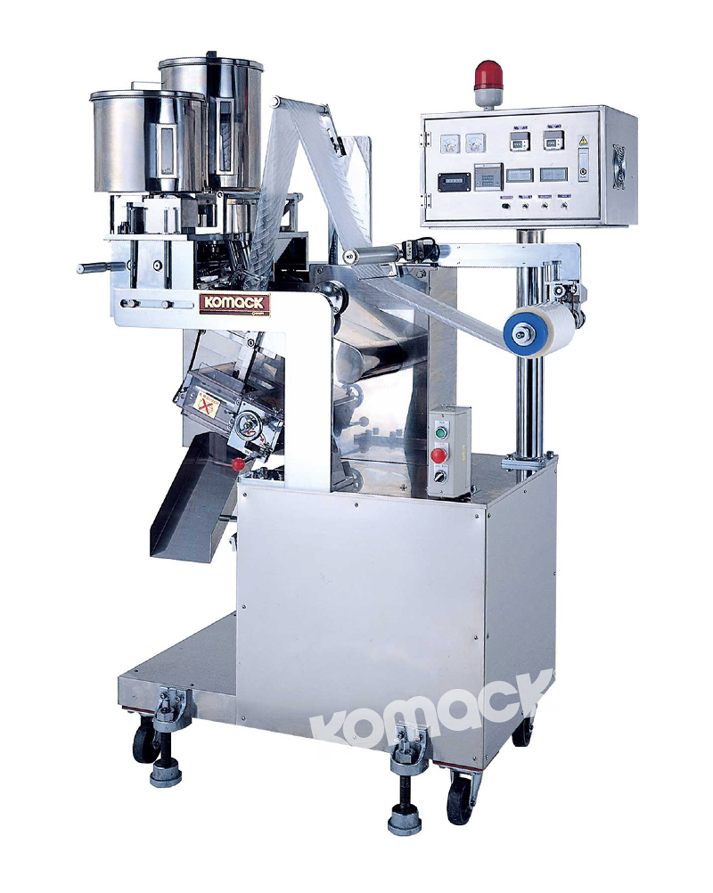 本機是2列袋式粉末、顆粒等專用充填包裝機。寬度方向制成的2列包裝袋中能同時填充包裝2種不同的粉末?顆粒??芍谱?邊封或4邊封包裝袋。