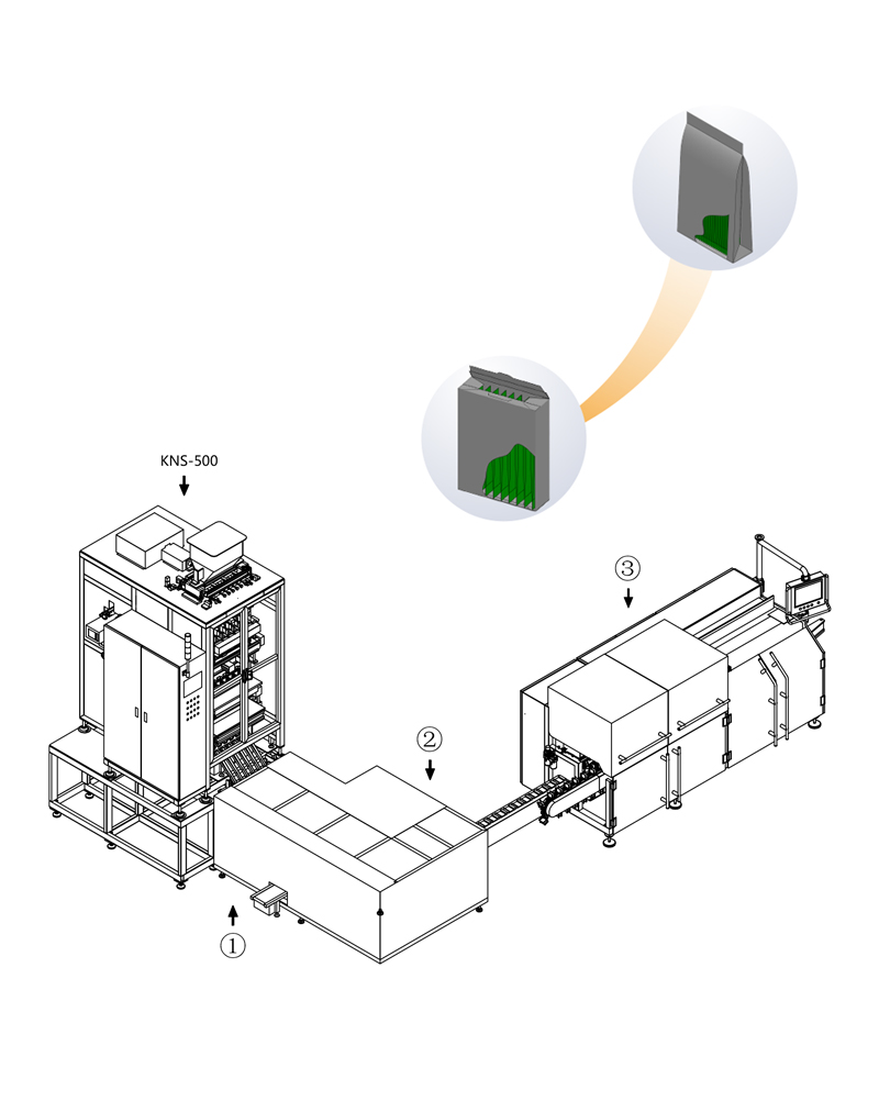 本全自動包裝生產(chǎn)線。由KNS-500自動條狀多列機(jī)、稱重部分、計數(shù)整列系統(tǒng)、自動裝盒部分組成,可以自動完成從原料灌裝到稱重剔除,自動計數(shù)整列到自動裝盒的一系列過程。此全自動生產(chǎn)線可以大大減少勞動力,獲得高效率。
